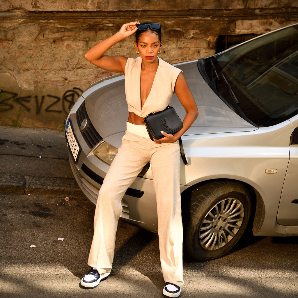 This is where a matching set makes your life easier. A jeans and t-shirt combo also works or a basic midi dress. Your base is solid. Throw on some heels, one or two more shiny pieces (jewelry) than you typically would, and a statement piece which in this look, is the bag.