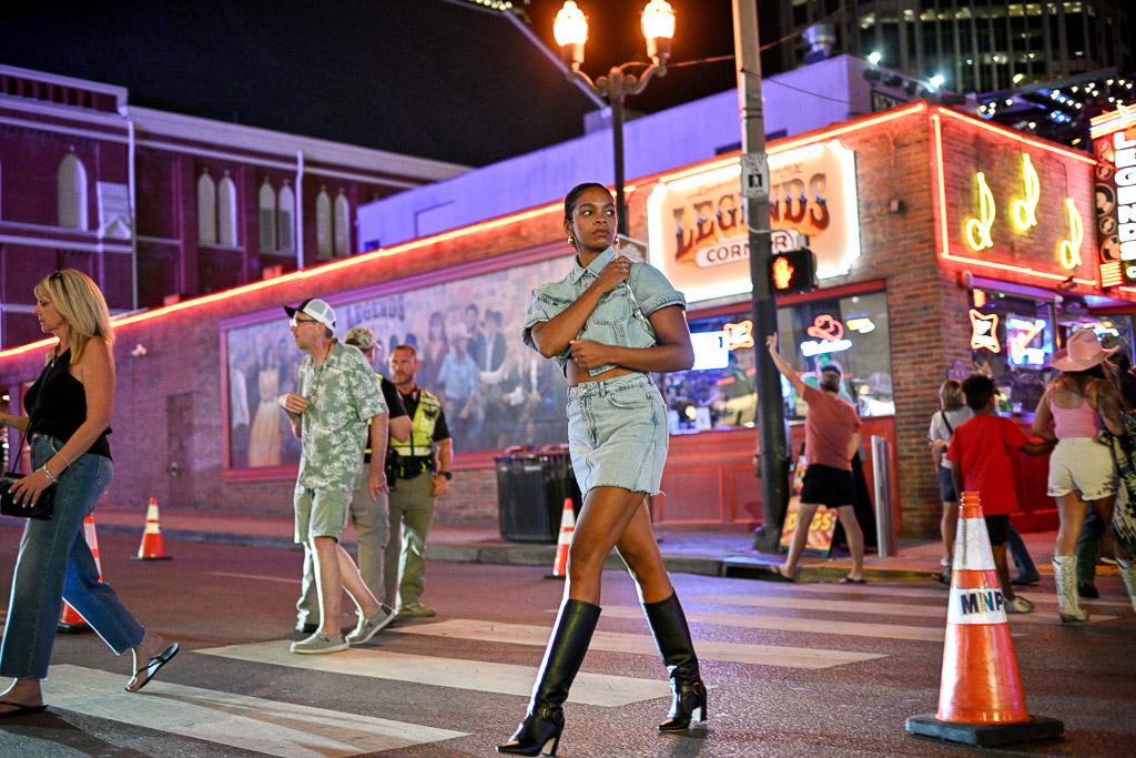 My street style denim on denim comes as a matching duo: cropped denim jacket and mini skirt in an old skool light wash. Rolled sleeves for a more casual feel. The high waisted mini makes it easy to play around with shoe options. Keeping all accessories light and in the neutral family, chic black boots to play with proportions- very important when going for a monochrome look. Keeping all accessories that are in line with my denim in silver but pops of gold in my earrings which connect with the gold detailing on my boots. Gold shades for some allure- and she's ready for the streets of Palm Springs. Update, she's now in Tennessee, so...ready for the streets of Nashville.