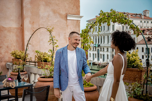 We arrived in the morning to an absolutely stunning walk up apartment. A garden terrace featuring magical views of the Grande Canal, that would later be the backdrop of many late nights and early mornings and eventually, our engagement photos. The interior was adorned with 16th century furniture, setting the scene for a whimsical but romantic feel. It couldn't have been anymore perfect than that. We spent that evening strolling the neighborhood, stopping to watch the gondolas pass under the bridges. A casual dinner at one of the restaurants along the canal by the Realto Bridge, as we bore witness to the fleeting sunset skies. After dinner, we took our time walking back towards the apartment, but not before stopping at the wine bar and ending our night with a bottle on the terrace.